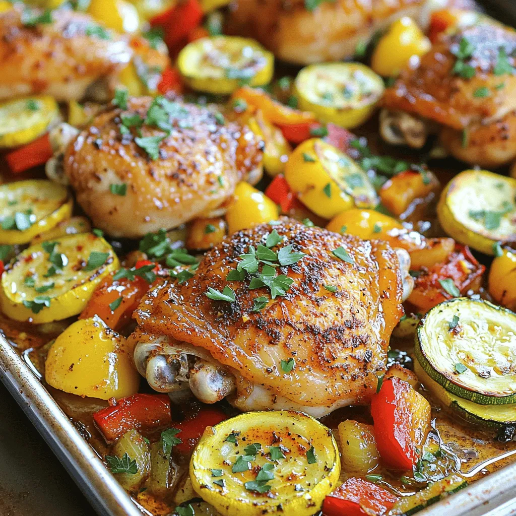 - 4 boneless, skinless chicken thighs - 2 medium zucchinis, sliced into half-moons - 1 red bell pepper, chopped - 1 yellow bell pepper, chopped - 4 cloves garlic, minced - 3 tablespoons olive oil The chicken thighs are juicy and cook well on the sheet pan. Zucchini and bell peppers add color and crunch. The garlic gives a nice aroma and flavor to the dish. The olive oil helps to keep everything moist as it bakes. - 2 tablespoons Cajun seasoning - 1 teaspoon smoked paprika - Salt and pepper to taste Cajun seasoning brings a bold and spicy taste. The smoked paprika adds depth and a touch of sweetness. Salt and pepper help to enhance all the flavors. Adjust the spice levels based on your taste. - Fresh parsley - Additional serving suggestions Fresh parsley adds a bright finish to the dish. You can serve it straight from the sheet pan for a rustic feel. For a nice touch, drizzle some extra olive oil around the plate. This adds color and makes the meal look even better. First, preheat your oven to 400°F (200°C). This step ensures even cooking. Next, line a large baking sheet with parchment paper. This makes cleanup much easier. Now, let's season the chicken thighs. Pat them dry with paper towels. This helps the spices stick better. In a small bowl, mix Cajun seasoning, smoked paprika, salt, and pepper. Rub one tablespoon of olive oil on the chicken. Use half of your spice mix to coat the chicken evenly. Make sure every piece is covered for the best flavor. It’s time to prepare the veggies. Take your zucchini, red and yellow bell peppers, and minced garlic. In a large bowl, toss them with the remaining olive oil and the rest of the Cajun spice mix. Ensure everything is well coated. Spread the seasoned vegetables evenly on your baking sheet. Place the chicken thighs on top of the veggies for a flavorful bake. Put your baking sheet in the preheated oven. Bake for 25-30 minutes. The chicken should reach an internal temperature of 165°F (75°C) when done. The vegetables should be tender. After baking, let it rest for 5 minutes. This step helps the juices settle. Before serving, garnish with fresh parsley for a lovely touch. To get the right Cajun flavor, you can adjust the spice levels. If you want more heat, add a bit more Cajun seasoning. For a milder taste, use less. Taste your spices before using them. This step helps you find the right balance. Marinating the chicken enhances its flavor. I suggest letting the chicken sit with the seasoning for at least 30 minutes. This wait allows the spices to soak in. For even more flavor, marinate it overnight in the fridge. To achieve crispy chicken skin, dry the chicken thighs with paper towels. This step removes moisture that can make the skin soggy. Rub the chicken with olive oil and seasoning before baking. The oil helps the skin crisp up nicely. For tender vegetables, cut them into even pieces. This ensures they cook at the same rate. Toss them with olive oil and spices, then spread them out on the baking sheet. This air circulation helps them roast evenly. For a rustic presentation, serve the chicken and veggies right from the sheet pan. This makes it easy and fun! If you prefer, plate the food individually. Drizzle some olive oil around the edge for a colorful touch. Pair this dish with rice or a fresh salad. The rice soaks up the flavors, while a salad adds crunch. Enjoy exploring different sides to find your favorite combinations! {{image_2}} You can switch out chicken thighs for chicken breasts. Breasts cook faster, so watch them closely. If you want seafood, shrimp or fish work great. They add a nice twist to the dish. Just remember to adjust the cooking time for these proteins. Shrimp cooks fast, while fish fillets may need a few extra minutes. Feel free to include other veggies. Carrots, asparagus, or even broccoli add color and flavor. You can mix in some cherry tomatoes for a pop of sweetness. If you want to change the spices, try Italian seasoning or a mix of herbs. This keeps the dish fresh and exciting. For a gluten-free meal, ensure your spices are certified gluten-free. Most spices are safe, but check the labels. You can also make this dish low-carb. Skip the starchy veggies and add more zucchini or bell peppers. This keeps the meal light but still very tasty. After enjoying your Cajun chicken and zucchini, store leftovers in proper containers. Use airtight containers to keep the meal fresh. Make sure to cool the food to room temperature before sealing. This helps avoid moisture build-up. Place the containers in the fridge. Your dish will stay tasty for up to three days. For longer storage, consider freezing. Use freezer-safe bags or containers. They help prevent freezer burn. You can freeze leftovers for up to three months. Just remember to label them with dates. To enjoy your leftovers, reheating is key. The best way is in the oven. Preheat your oven to 350°F (175°C). Place the chicken and veggies on a baking tray. Cover it with foil to keep moisture in. Heat for about 15-20 minutes or until warmed through. You can also use the microwave, but it may change the texture. Heat in short bursts, stirring in between. This helps retain flavor. No one likes dry chicken! Always check that the internal temperature reaches 165°F (75°C) before serving. Bake the chicken and zucchini for 25 to 30 minutes. The chicken needs to reach 165°F. Check the veggies; they should be tender. You can use a meat thermometer to be sure. Yes, you can grill the chicken if you prefer! Use medium heat on your grill. Cook the chicken for about 6 to 8 minutes on each side. This will give you great grill marks and flavor. This dish pairs well with rice or quinoa. You can also enjoy it with a fresh salad. Consider adding crusty bread to soak up the juices. Add more Cajun seasoning or a pinch of cayenne pepper. You can also mix in some diced jalapeños with the veggies. For a zesty kick, try adding hot sauce before serving. In this blog post, I shared a tasty r