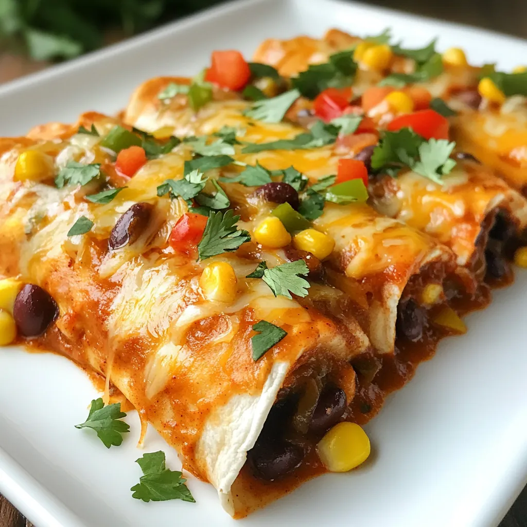 Delicious enchiladas filled with spicy black beans, corn, and bell peppers, topped with cheese and enchilada sauce.
