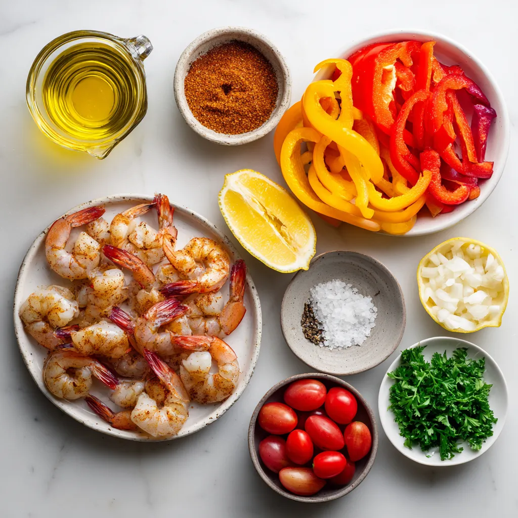 Each ingredient plays a key role in the dish. The shrimp brings protein and a sweet flavor. The Cajun seasoning adds heat and depth, making it bold. Olive oil helps in cooking and adds richness. Bell peppers and onions bring crunch and color. Garlic gives a nice aroma. Cherry tomatoes add juiciness. Lemon juice brightens the dish and balances the spice.