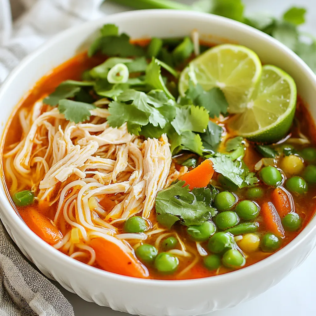 To make Spicy Sriracha Chicken Noodle Soup, gather these key ingredients: - 2 boneless, skinless chicken breasts - 4 cups chicken broth - 1 cup water - 2 tablespoons Sriracha sauce (adjust to taste) - 1 tablespoon soy sauce - 1 tablespoon ginger, minced - 3 cloves garlic, minced - 1 medium onion, diced - 2 carrots, sliced - 1 bell pepper, diced - 1 cup snap peas - 200g rice noodles (or your preferred noodles) - 2 green onions, sliced (for garnish) - Fresh cilantro, chopped (for garnish) - Lime wedges (for serving) - Salt and pepper to taste Each ingredient adds a unique flavor. The chicken provides protein, while the broth gives depth. Sriracha adds spice, making this soup a flavor blast. Garnishes make your soup look and taste better. Here are some to consider: - Sliced green onions - Chopped fresh cilantro - Lime wedges for a fresh squeeze These garnishes add bright colors and fresh flavors. They also enhance the overall experience of enjoying your soup. You can swap some ingredients if you need to. Here are a few ideas: - Use vegetable broth instead of chicken broth for a lighter base. - Swap chicken for tofu or chickpeas to make it vegetarian. - Try different noodles, like udon or egg noodles, for a fun twist. - Use red pepper flakes instead of Sriracha for a different type of heat. These substitutions keep the dish fresh and exciting, allowing for creative cooking! {{ingredient_image_1}} Sautéing Aromatic Ingredients Start by heating a tablespoon of oil in a large pot over medium heat. Once hot, add the diced onion, minced garlic, and ginger. Sauté these for 2 to 3 minutes. You want them fragrant and the onion translucent. This step builds a strong flavor base for your soup. Adding Vegetables and Broth Next, toss in the sliced carrots and diced bell pepper. Cook these for another 3 minutes until they soften a bit. Then, pour in 4 cups of chicken broth and 1 cup of water. Bring the mixture to a boil. Don't forget to season with salt and pepper to enhance the taste. Once your broth is boiling, add the two boneless, skinless chicken breasts. Lower the heat to a simmer and cover the pot. Let the chicken cook for about 15 to 20 minutes. It should be cooked through and tender. Afterward, remove the chicken from the pot. Use two forks to shred it into bite-sized pieces. Now, return the shredded chicken to the pot. Stir in 2 tablespoons of Sriracha sauce and 1 tablespoon of soy sauce. Taste your soup and adjust the seasoning if needed. If you want it spicier, add more Sriracha. Then, add 1 cup of snap peas and 200g of rice noodles. Cook everything for about 4 to 5 minutes, until the noodles are tender and the peas are bright green. Your Spicy Sriracha Chicken Noodle Soup is almost ready! Serve it hot, garnished with sliced green onions and chopped cilantro. Add lime wedges on the side for a fresh twist. Enjoy your flavorful creation! To get the best flavor in your Spicy Sriracha Chicken Noodle Soup, focus on the basics. Start with fresh ingredients. Fresh garlic, ginger, and vegetables add a nice punch. Sauté the onion, garlic, and ginger until they are soft and fragrant. This step builds a strong base for your soup. Adjust the Sriracha sauce to match your taste. If you like heat, add more. If you prefer mild, start with less. For the perfect soup texture, balance is key. Use enough broth and water so that your soup is not too thick. Adding the rice noodles helps thicken it, but be careful not to overcook them. They should be tender but still hold their shape. If the soup feels too thick, add more broth or water. You can always adjust it as it simmers! You can easily change the spice level of your soup. If you want it spicier, add more Sriracha during cooking. Taste the soup after you stir it in. If you want a milder flavor, use less Sriracha. You can also serve lime wedges on the side. The lime juice adds brightness and can tone down the heat. Don't forget to add fresh cilantro for flavor and a nice touch! Pro Tips Adjust the Heat: If you're not a fan of too much spice, start with less Sriracha and add more gradually to find your perfect heat level. Use Fresh Ingredients: Fresh ginger and garlic will enhance the flavor of your soup significantly compared to powdered versions. Cook Noodles Separately: For a less soggy texture, consider cooking the noodles separately and adding them just before serving. Garnish Generously: Don't skip the garnishes! Fresh cilantro and lime add a bright freshness that complements the spiciness of the soup. {{image_2}} You can easily switch out chicken. Try shrimp for a lighter taste. Tofu adds a nice texture for a vegetarian option. For a richer flavor, consider using beef. Cook the beef until it's tender. This keeps the soup hearty and warm. Rice noodles work great in this soup. But you can use egg noodles if you prefer. For a gluten-free option, try quinoa noodles. They add a unique taste and texture. Just remember to adjust cooking times as needed. Feel free to mix in your favorite veggies. Spinach adds a nice color and flavor. Zucchini is a good choice for some crunch. Broccoli florets can add both color and nutrients. Just cut them small enough to cook through. Experimenting with vegetables lets you customize your soup. Store your leftover soup in an airtight container. Let it cool before sealing. Place it in the fridge. It will stay fresh for about 3-4 days. If you want, you can also divide it into single servings. This makes it easy to grab for lunch or dinner. To reheat, pour the soup into a pot. Heat it on low to medium heat. Stir it often to ensure even heating. You can also use a microwave. Place the soup in a microwave-safe bowl. Heat it for 1-2 minutes, stopping to stir halfway through. Make sure it is hot all the way through. You can freeze this soup for later use. Use freezer-safe containers or bags. Leave some space at the top. This allows for expansion as it freezes. The soup can stay good in the freezer for up to 3 months. When ready to ea