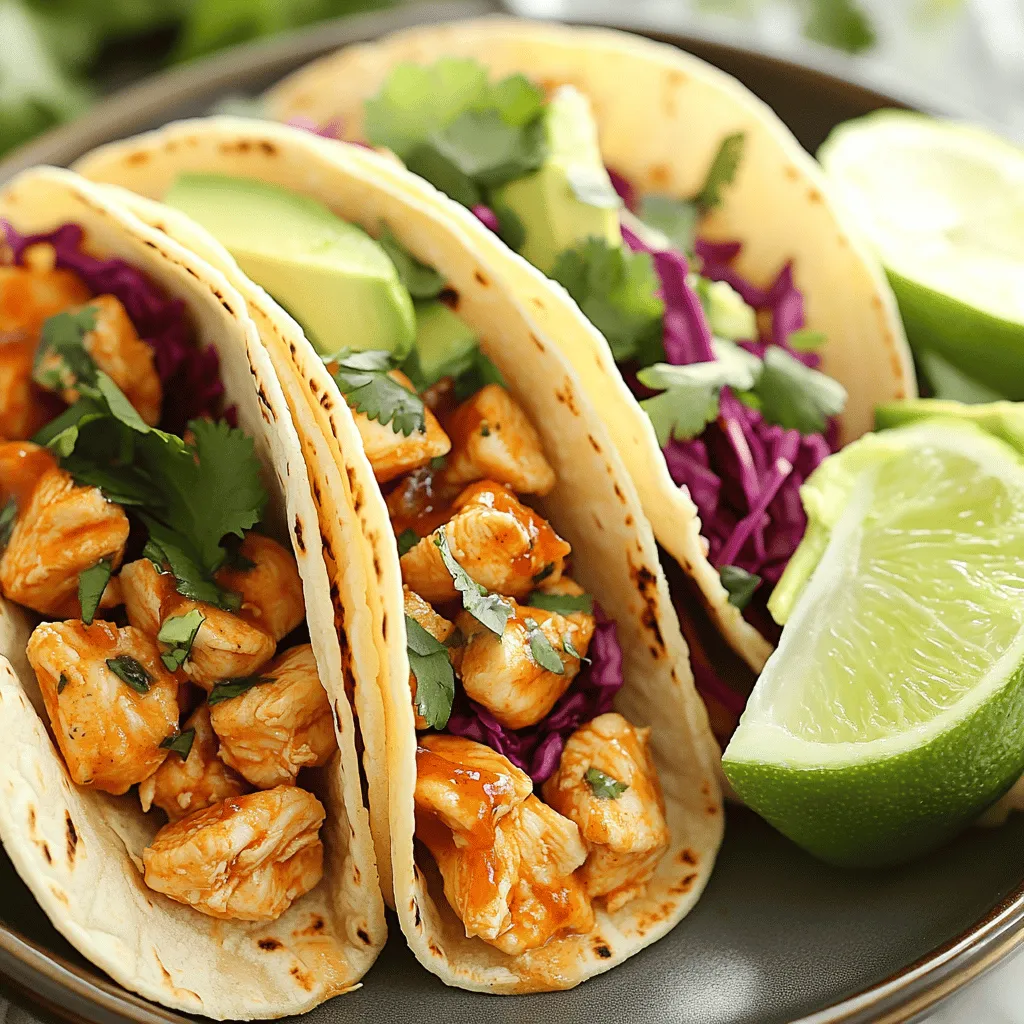 Corn tortillas are key for holding all the goodness. They are soft and pair well with the chicken. Shredded red cabbage adds crunch and color. A sliced avocado brings a creamy texture. Fresh cilantro adds a burst of flavor. These toppings make the dish fresh and exciting.