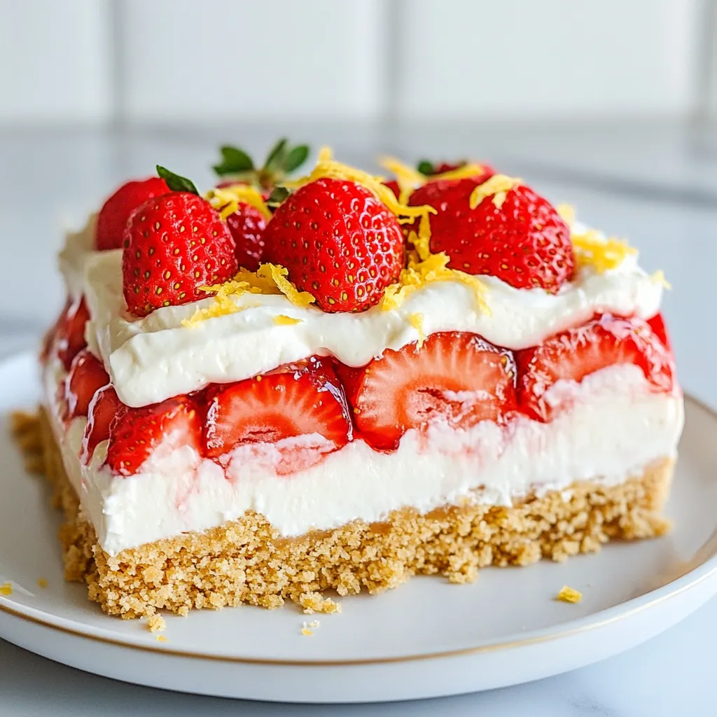 When you’re ready to serve, zest one lemon over the top of the cake. This adds a bright, fresh flavor. You can also garnish with a few whole strawberries for a lovely touch. Cut the cake into squares and serve on plates. Drizzle some extra strawberry juice on top if you like. Enjoy your delicious Strawberry Cheesecake Icebox Cake!
