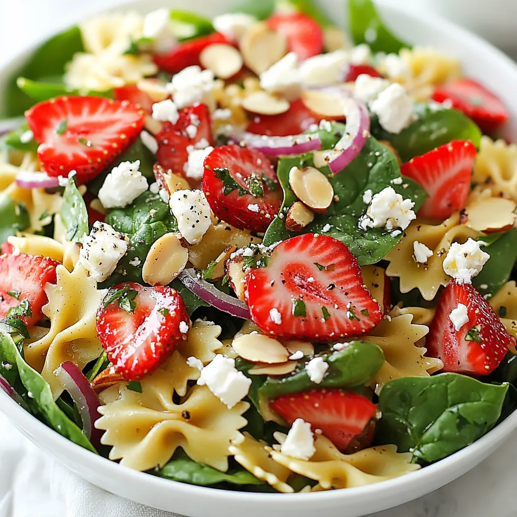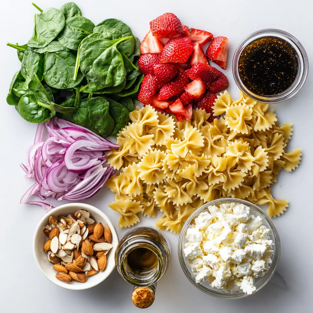 Each ingredient plays a key role in the flavor. Bowtie pasta adds texture and shape. Fresh spinach brings a nice crunch and color. Strawberries add sweetness and juiciness. Feta cheese gives a creamy, salty bite. Toasted almonds add a nutty flavor and crunch. Red onion offers a sharp contrast. Balsamic vinaigrette ties it all together with tang. Salt and pepper enhance the taste.
