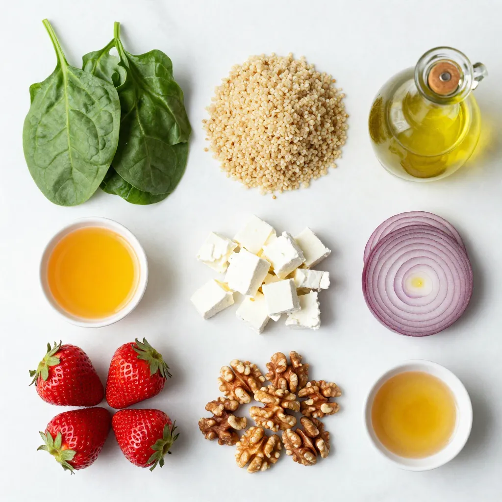• In a large bowl, combine the cooked quinoa, spinach, sliced strawberries, crumbled feta cheese, chopped walnuts, and red onion.
