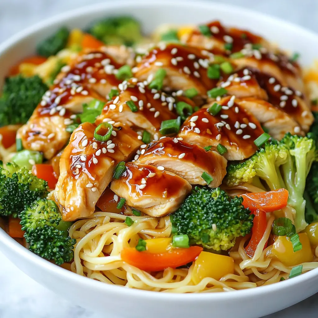 A delicious stir-fry dish featuring tender chicken, colorful vegetables, and egg noodles tossed in a sweet teriyaki sauce.