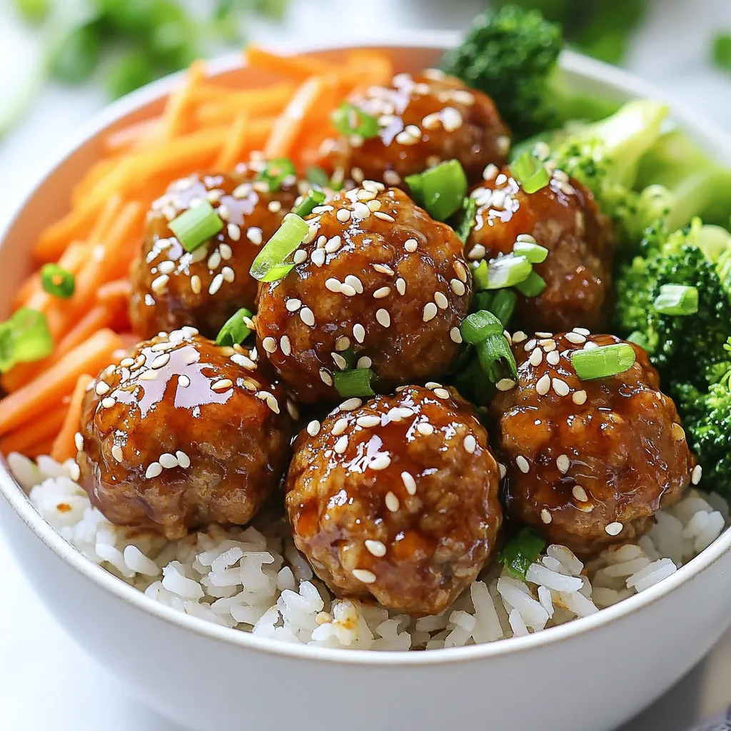 Garnish with sesame seeds and green onions. This adds texture and a fresh taste. You can also serve these meatballs with a side salad or pickled veggies for more balance. Enjoy the flavors and colors in your bowl!