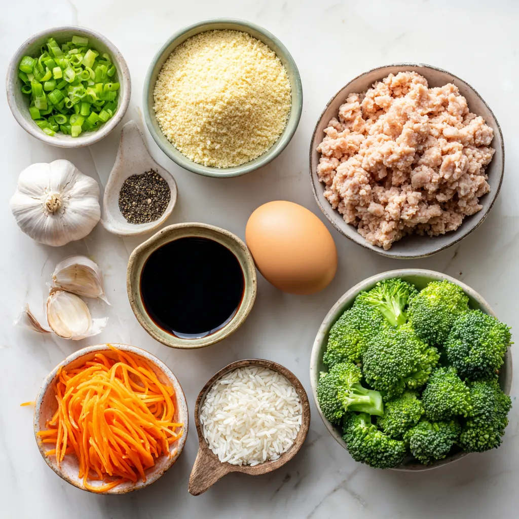 Ground chicken or turkey is lean and packed with protein. Breadcrumbs add texture and help bind the meatballs. Green onions offer a fresh taste and extra nutrients. Garlic and ginger boost flavor and have health benefits, like aiding digestion. Teriyaki sauce provides a sweet and savory glaze, while sesame oil adds richness and aroma. Jasmine rice makes a fragrant base, and broccoli and carrots bring vitamins and color to your bowl. Plus, sesame seeds add a nice crunch and extra flavor.