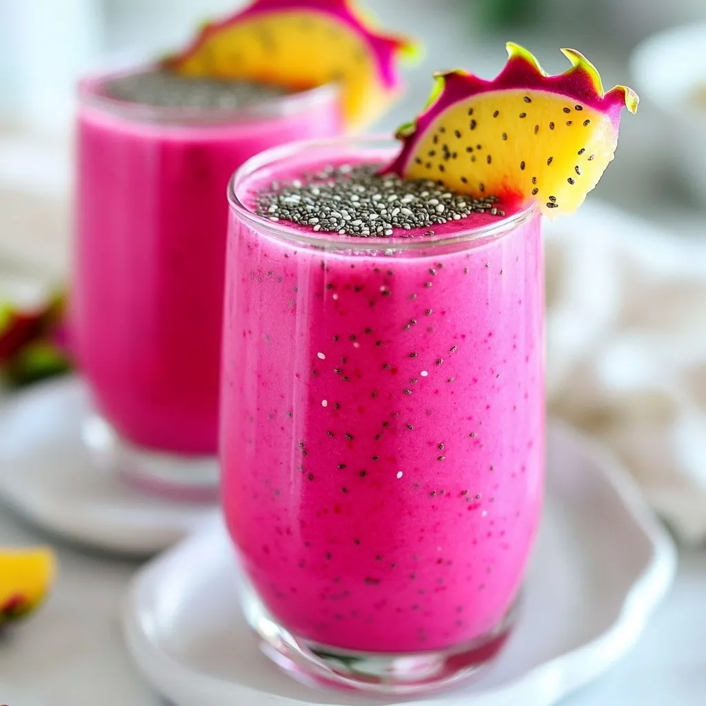 Pour your smoothie into chilled glasses. The vibrant pink color looks amazing! To make it even more special, garnish with extra dragon fruit slices or pineapple on top. You can also sprinkle some chia seeds for texture.