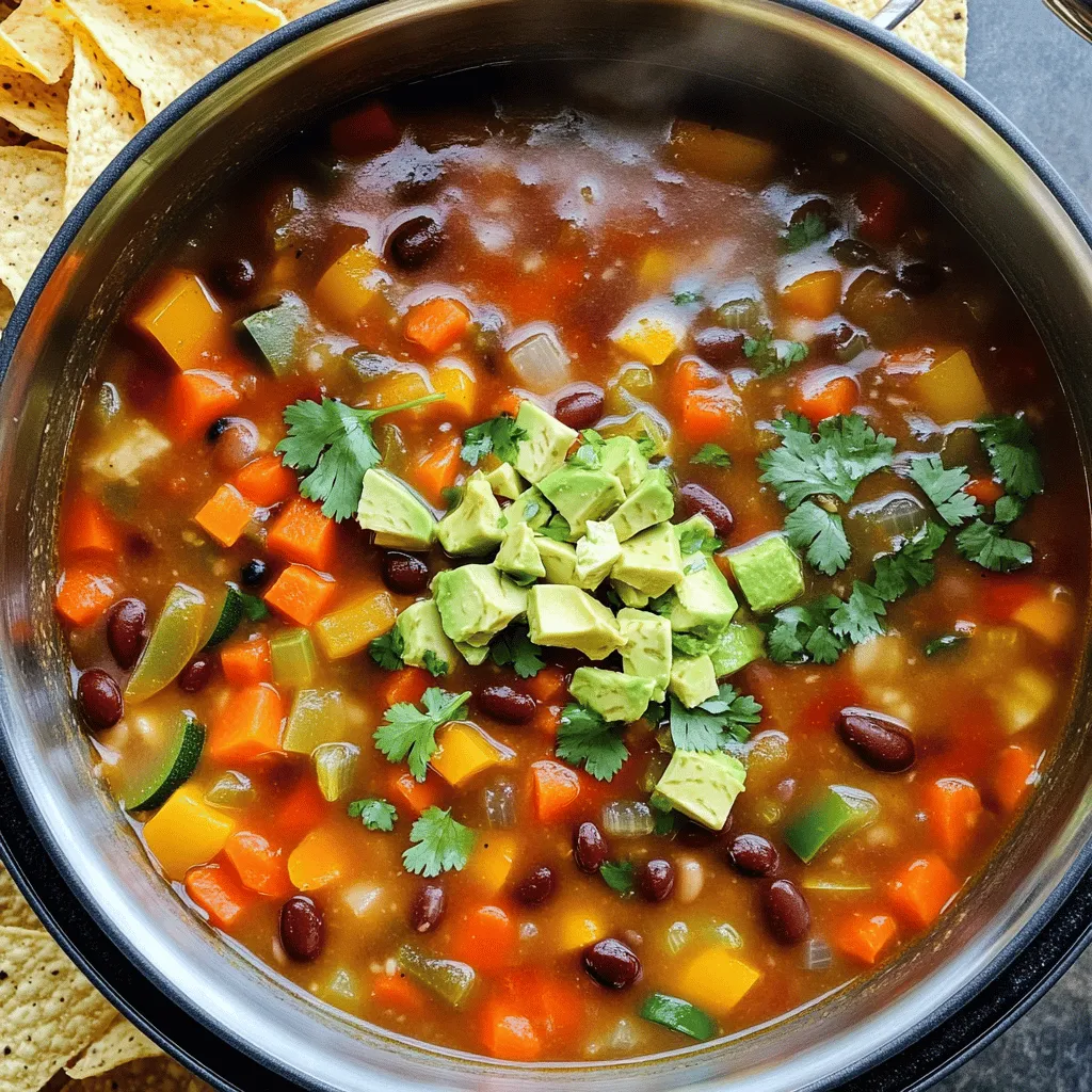 Garnishes make the soup pop! I love using fresh cilantro for its bright flavor. Diced avocado adds creaminess and healthy fats. Crunchy tortilla chips give a fun texture contrast. Serve the soup hot with these tasty toppings for a delightful meal!