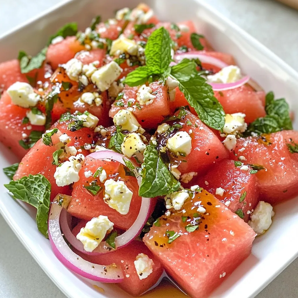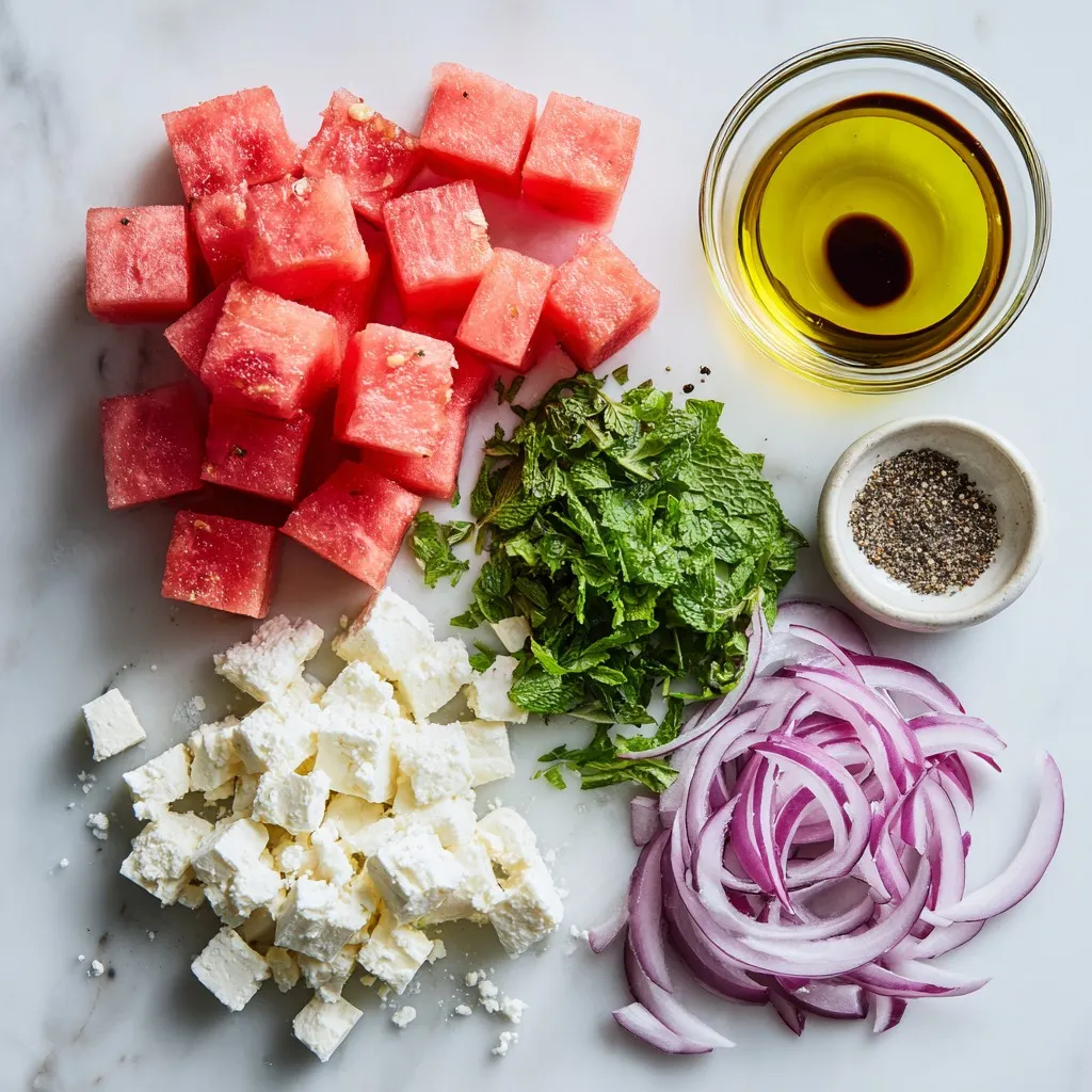 The main ingredients make this salad bright and tasty. Watermelon gives a sweet and juicy base. Feta adds a creamy and salty touch. Fresh mint leaves bring a cool flavor. The red onion adds a bit of crunch and spice. Together, they create a delightful mix.